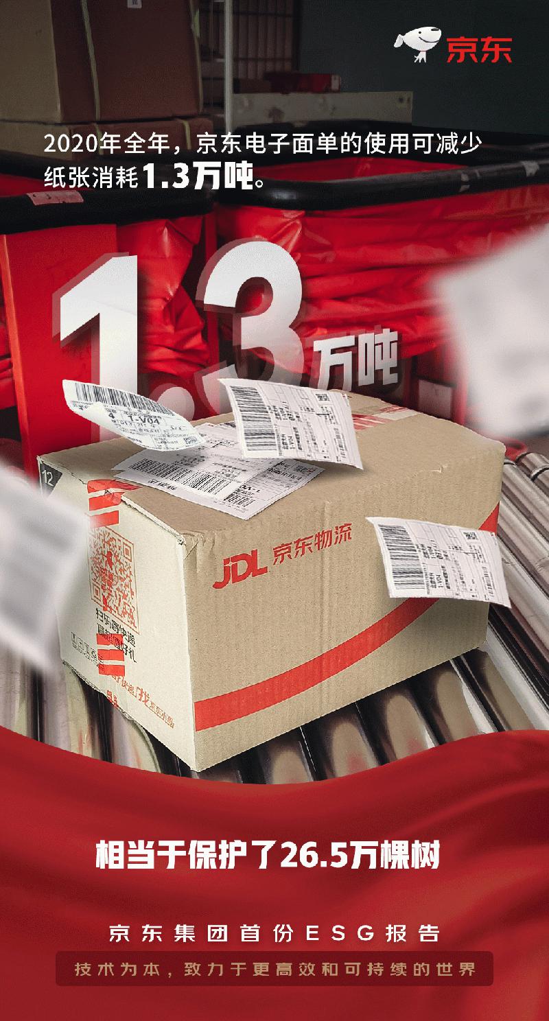 在包装方面,京东物流通过仓内无纸化作业以及电子面单,最大化地节约了纸张使用。仅2020年全年,京东电子面单的使用可减少纸张消耗1.3万吨。