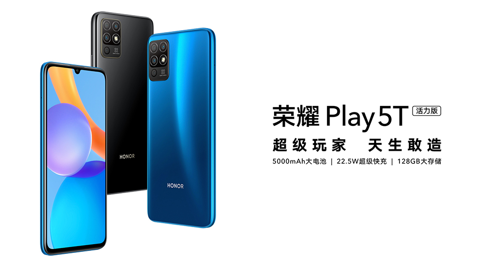 4月27日,荣耀Play 5T正式开售,6GB+128GB版本售价为1299元。荣耀Play 5T搭载联发科P35处理器,采用6.6英寸HD+LCD水滴屏,拥有德国莱茵护眼认证,可抑制有害蓝光。内置5000mAh大电池,在AI智慧节电技术加持下,可进行游戏12.2小时,视频通话10.2小时,在线追剧18.6小时,满足一天的日常使用需求。支持22.5W超级快充,30分钟便可以充电43%。后置1300万主摄+500万广角以及两颗200万景深、微距镜头。采用侧边指纹+人脸识别两种解锁方案,运行Magic UI 4.0智慧系统。