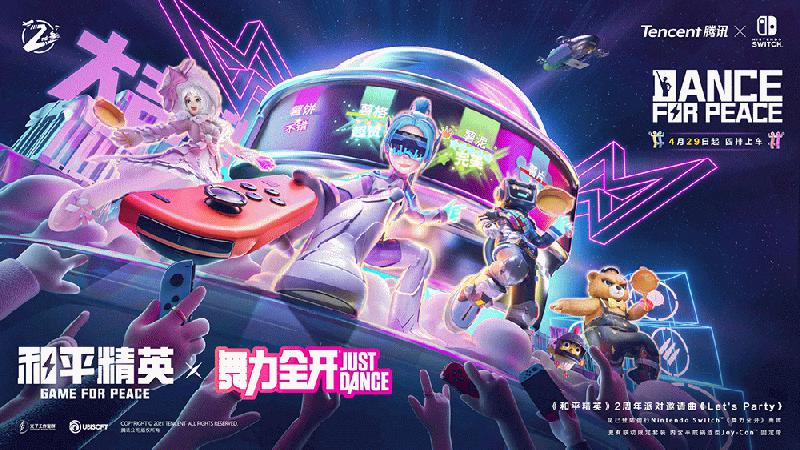 腾讯Nintendo Switch、育碧《舞力全开》、腾讯光子工作室打造的《和平精英》三方联动合作"DANCE FOR PEACE"(大吉大利,舞力全开)已于2021年4月29日正式开启。除游戏内容联动外,《舞力全开》X《和平精英》游戏联动限定套装同时推出。套装包含Nintendo Switch 1台、《舞力全开》"标准版"游戏兑换卡1份、以及平底锅造型Joy-Con™固定带。套装官方建议零售价2398元,已在Nintendo Switch京东官方旗舰店开启预约,并将于2021年5月11日在Nintendo Switch京东超级品牌日正式发售。