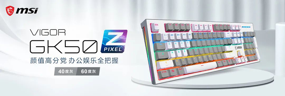 微星GK 50 Z PIXEL百元级机械键盘新品上市,即GK50Z PIXEL 40度灰和GK50Z PIXEL 60度灰,其中白色部分较多的为“40度灰”,灰色部分较多的为“60度灰”,两者在键盘正面的颜色占比不同。