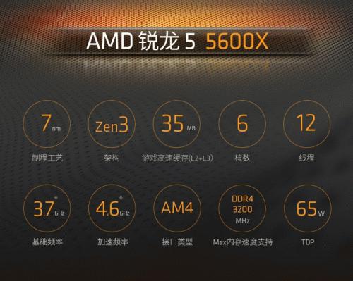 下面我们就来详细了解一下这款CPU。AMD锐龙5 5600X采用了全新的Zen3架构,7nm制程工艺,6核心12线程的配置以及高达4.6GHz的Max主频和35MB的高速游戏缓存。