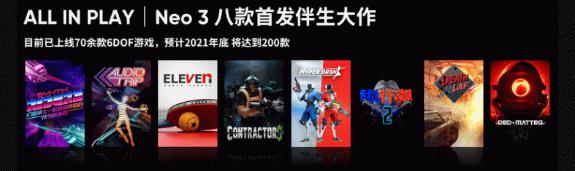 值得一提的是,Pico此次随Neo 3新机同步首发了8款Top 级 VR一体机大作,包括《雇佣战士(CONTRACTORS)》、《幻音骑士(Synth Riders)》、《 Eleven Table Tennis》、 《超能军团(Hyper Dash)》、《红色物质(Red Matter)》等当前备受玩家瞩目的优质游戏内容。而《SUPERHOT VR》、《OhShape》等在Neo 2平台广受好评的经典大作也已完成移植。截至发布,Pico Neo 3内容Store目前已积累优质6DoF游戏约70余款,据悉,Pico 今年还将引进大量优质游戏,年底预计将达200+款。