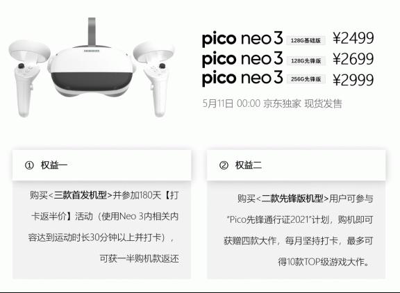 据悉,Pico Neo 3系列中面向消费级市场的三款机型,将于5月11日 00:00在京东平台独家现货开售,首批购机用户最快将在5月11日当天拿到新品,上手尝鲜。其中Pico Neo 3 128G基础版,售价仅为2499元;128G先锋版售价2699元; 256G先锋版,售价2999元。购买先锋版机型可参与“Pico先锋通行证2021”计划,购机即可获赠四款首发大作,每月坚持打卡,最多可得10款TOP级游戏大作。同时,早前预售提及的Pico Neo 3【打卡半价购】活动也已经同步启动,三款首发机型均可参与。