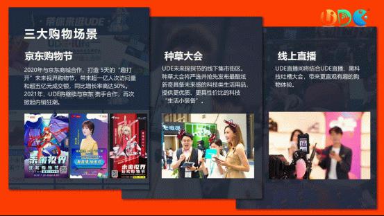 年轻人的买买买,可以更酷。UDE 2020 与京东商城合作,打造 “趣打开”未来视界购物节,带来超一亿人次访问量和超五亿元成交额,同比增长率高达50%;2021年,UDE将继续与京东携手合作,再次掀起黑科技产品狂销模式。“UDE种草大会”专区,线上+线下同步,为消费者带来更好玩更奇特的科技生活体验。探探直播间邀请网红、KOL、大咖到场,直播带货。联合展商现场通过新品展示、问答、互动、限时促销等精彩纷呈的活动,促进现场成交量。