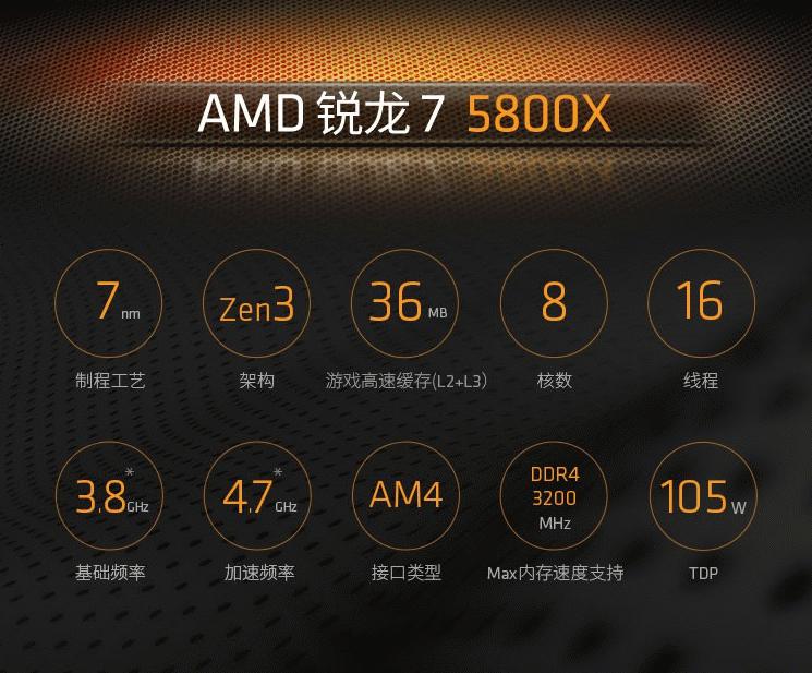 AMD锐龙7 5800X优秀的CCX结构以及出色的单核性能,让游戏启动,运行都顺畅无忧。8核心16线程的高规格配置,让游戏时刻保持流畅运行的同时还可以拥有更多后台软件体验,36MB的游戏高速缓存让您告别卡顿掉帧,拥有沉浸式的游戏体验。