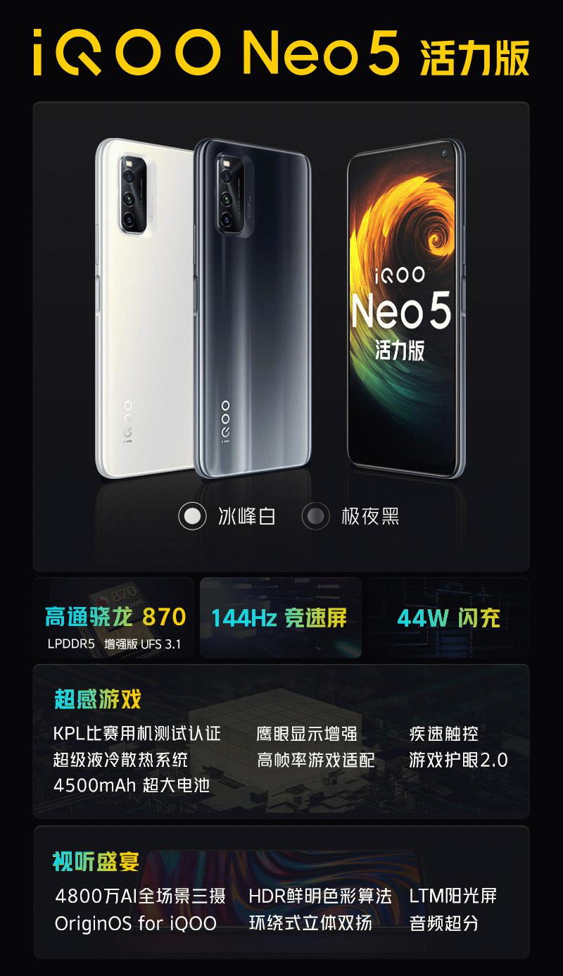 iQOO Neo5活力版尺寸为163.97×75.53×8.93mm,重量约为198.3g,有极夜黑、冰峰白两种配色。采用6.57英寸FHD+LCD屏,144Hz高刷新率,侧边指纹解锁方式。支持游戏护眼2.0,可进行智能护眼调整,在保证视觉效果的同时带来护眼效果。搭载高通骁龙870处理器,LPDDR5及增强版UFS 3.1,自带内存融合技术,支持扩展部分存储转为运行内存,让8GB等效11GB运存。后置矩阵三摄,分别为48MP主摄+8MP超广角+2MP微距,前置镜头为16MP。超级液冷散热系统可覆盖发热源头,CPU温度可直降10°。内置4500mAh大容量电池,支持44W快充。