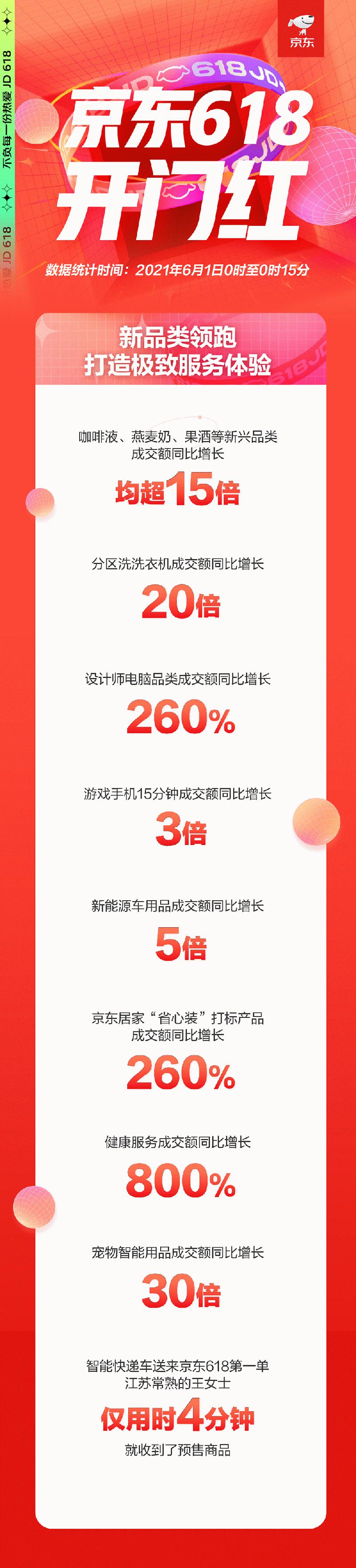 6月1日零点起,2021"京东618,18周年庆"迎来开门红,用户从5月24日预售以来激发的消费热情瞬间爆发。其中,京东超市整体成交额同比增长超7倍,京东生鲜成交额同比增长156%。大量品牌的销售增长大幅超预期,如iPhone产品5秒成交额破亿、小米手机5分钟成交额破亿,飞鹤、乐高、联合利华成交额同比增长10倍、15倍、20倍;超过100个服饰KA品牌成交额同比增长超过2倍,超过20个设计师品牌成交额同比增长10倍以上。与此同时数十万中小商家也迎来了高速增长。今年京东618,京东通过与达达集团深化全渠道战略合作,已经包含生鲜、快消、手机、数码、母婴 、医药、个护、美妆等诸多品类,覆盖全国超过1400个区县。
