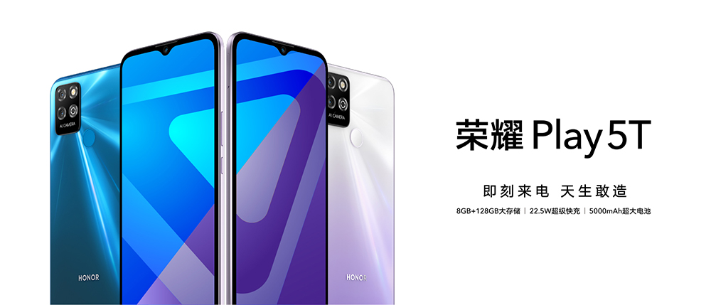6月1日,荣耀Play系列新成员--Play5T正式开售,拥有幻夜黑、极光蓝、钛空银三款配色。荣耀Play5T采用6.5英寸水滴屏,分辨率为1600×720,通过德国莱茵低蓝光护眼认证,可减少有害蓝光。内置5000mAh大电池,支持22.5W超级快充,30分钟便可以充电43%。后置双摄像头,矩阵设计,包括一颗1300万像素高清镜头以及一颗200万像素景深镜头。支持后置指纹和人脸识别解锁,内置独立FM天线,不插耳机、不用流量也能听广播。
