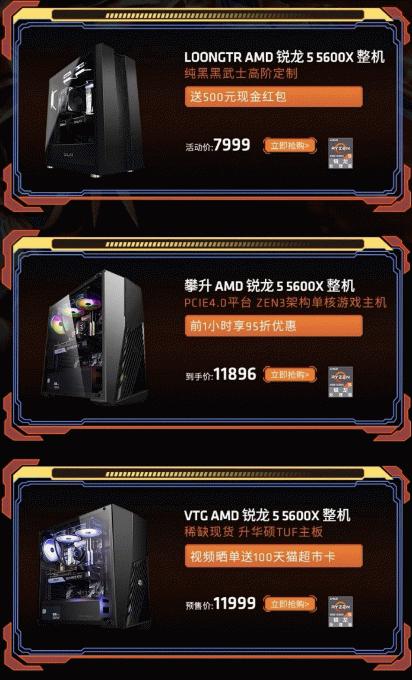 而在AMD天猫旗舰店的整机活动更为刺激,非常考验DIY玩家们的手速和网速了,指定整机前15秒购入可以抢免单机会,同时部分机型晒单返猫超卡。如果对于抢购特别有自信的朋友们不如来AMD天猫官方旗舰店试试运气。