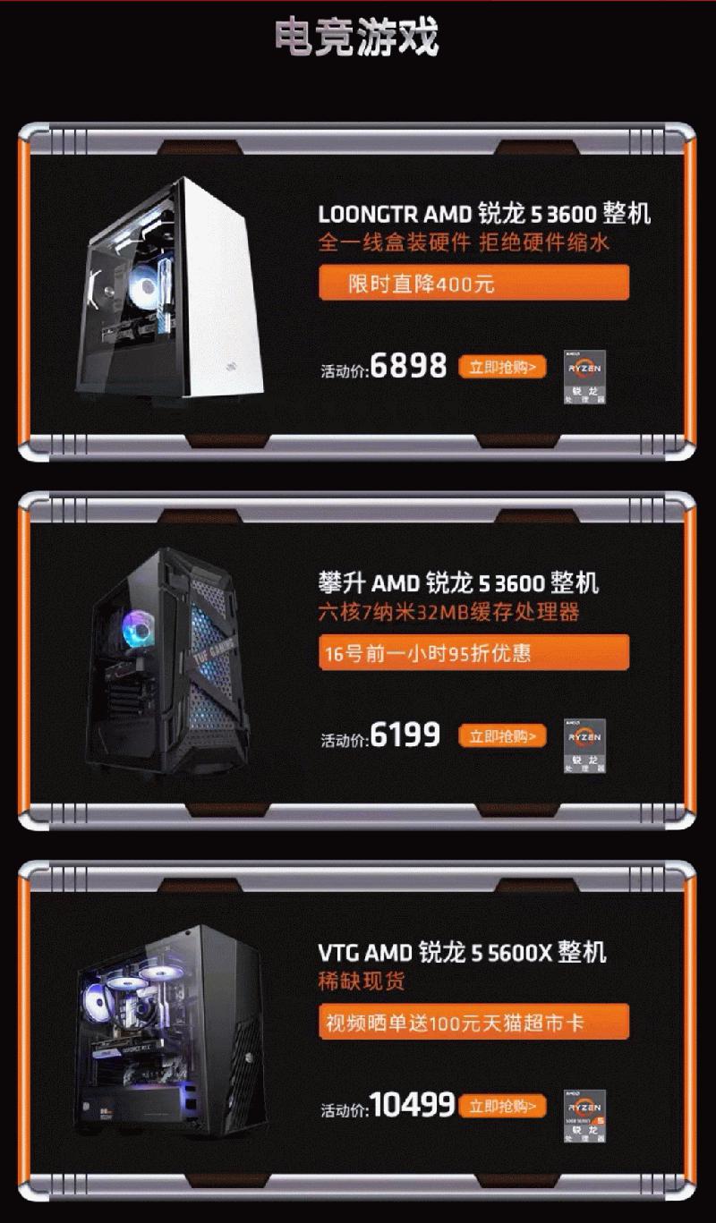 AMD天猫旗舰店的整机活动涉及的品牌更多一些,活动时间仅限6月16日到6月18日,指定型号整机限时直降,同时部分机型晒单还送天猫超市卡。