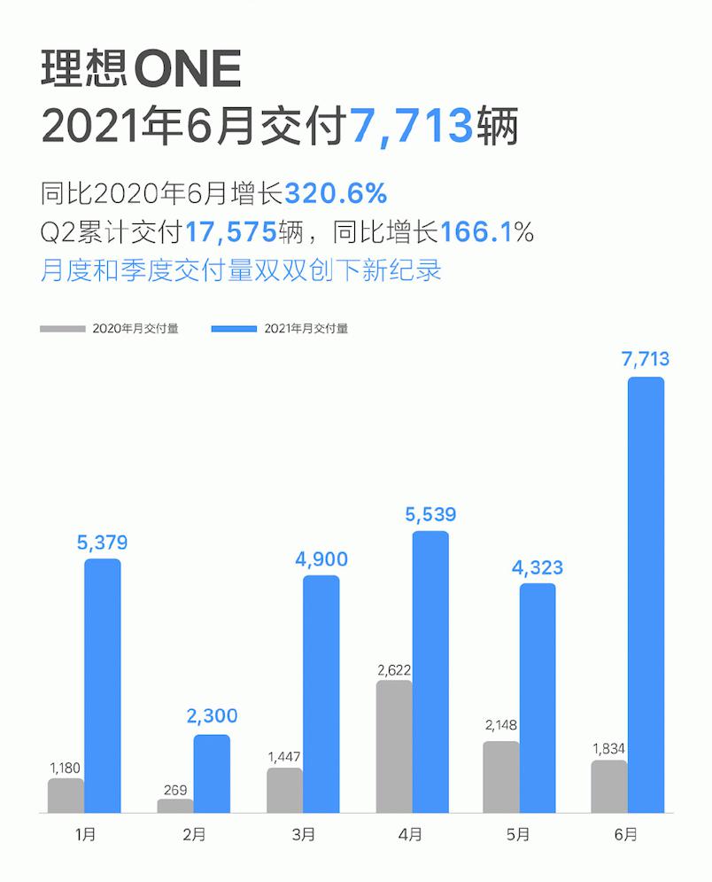 7月2日,理想汽车公布6月交付数据。理想汽车6月交付7713辆理想ONE,同比增长320.6%,环比增长78.4%,创单月交付量新纪录。同时,理想汽车6月新增订单量超过1万,创下历史新高。在造车新势力阵营中,理想ONE仍然是销量最高的单一车型。2021年第二季度,理想汽车累计交付17575辆,同比增长166.1%,环比增长39.7%,创季度交付量新纪录,并超越此前财报指引数据上限。