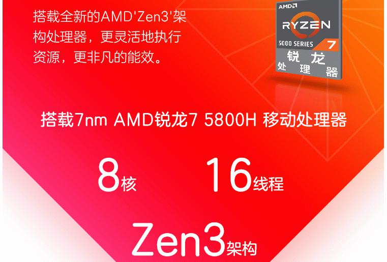 AMD锐龙7 5800H标压处理器的性能表现早已得到了众多玩家的认可,ZEN3架构8核心16线程、最高睿频4.4GHz,可提供桌面级的强劲性能表现。同时搭配的独显则是全新AMD Radeon RX 6600M独显,突破性的RDNA2架构可在1080P分辨率下提供高刷新率游戏体验。
