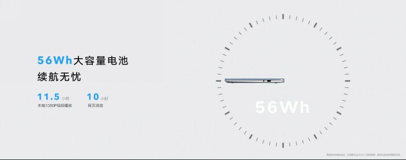 此外,荣耀MagicBook 14/15锐龙版还配有56Wh的大电池,最高可以支持11.5h的本地视频播放,轻松应对各种时刻,不让灵感轻易断电。 即便是长途旅行或出差也不用担心,荣耀MagicBook 14/15锐龙版采用65W可分离双头USB-C充电器,重量仅为160g(仅充电头),不仅外形小巧易携带,充电线也可单独作为数据线使用。