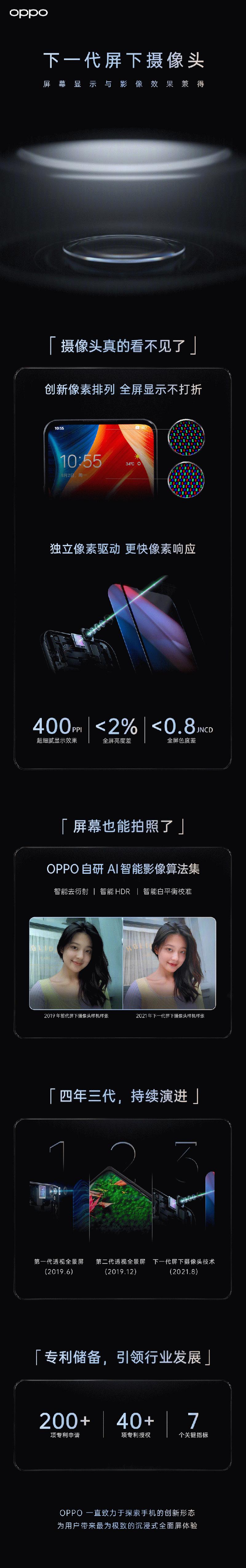 8月4日,OPPO正式官宣下一代屏下摄像头技术。为了保证屏下摄像区域的显示效果,该区域采用透光率更高的"透明材料",在不减少像素数量的情况下,略微降低像素体积,保证400ppi的显示效果。同时,也将传统的屏幕走线改为透明走线,通过工艺和设计的调整,让显示精确性有了大幅提示,借助显示算法补偿技术,实现精准控制全屏亮度差小于2%,色度差小于0.8JNCD。为了达到最佳的自拍效果,通过上万张照片训练AI去衍射算法模型,包括白平衡算法+HDR算法+AI去雾算法,从而有效控制光源中的衍射问题。官方表示,OPPO屏下摄像头技术历时4年研发,内部经历了三次迭代,申请了200+专利,团队一直致力于探索手机的创新形态,为用户带来最为极致的沉浸式全面屏体验。
