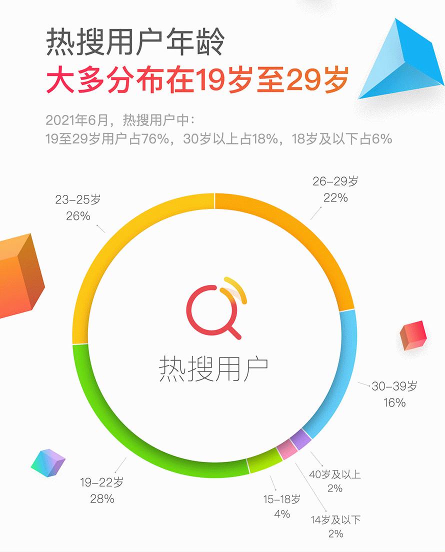 在引发全网关注的爆词方面,2021上半年热搜泛社会爆词达到27个,数量提升至9倍,占⽐从25%提升⾄39%,显著高于以往。从年龄分布上看,19-29岁是热搜的主要用户群体。