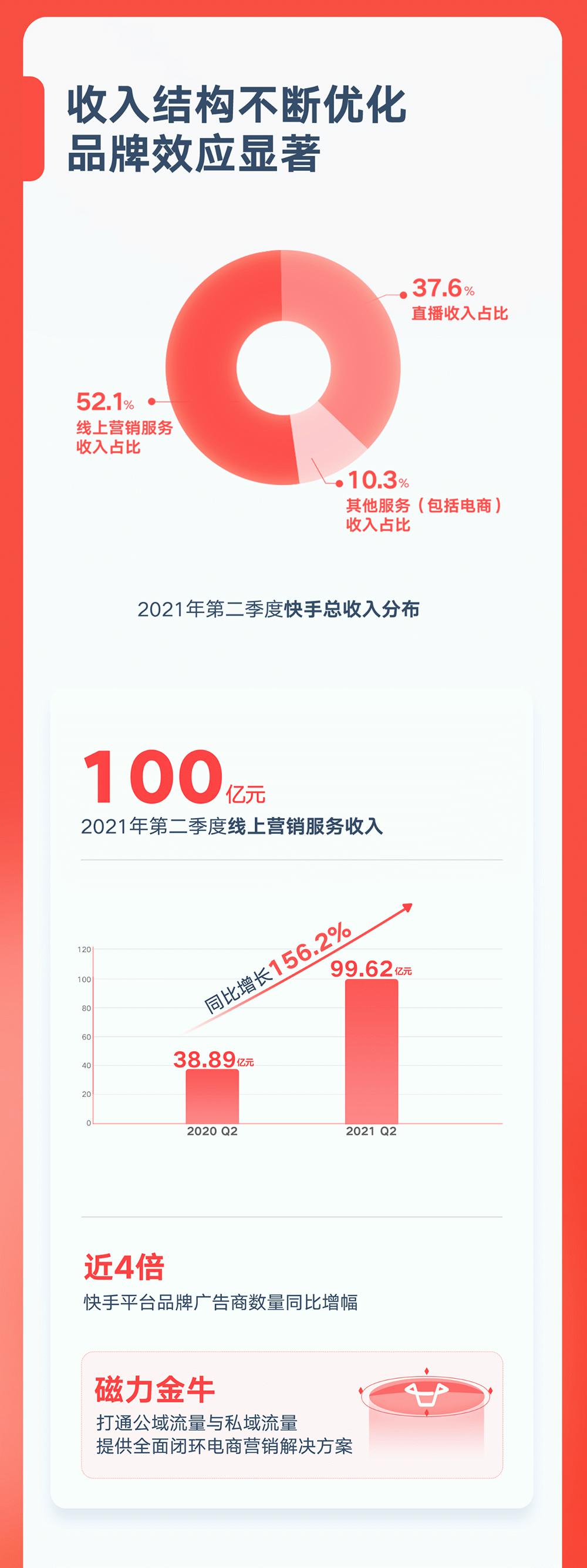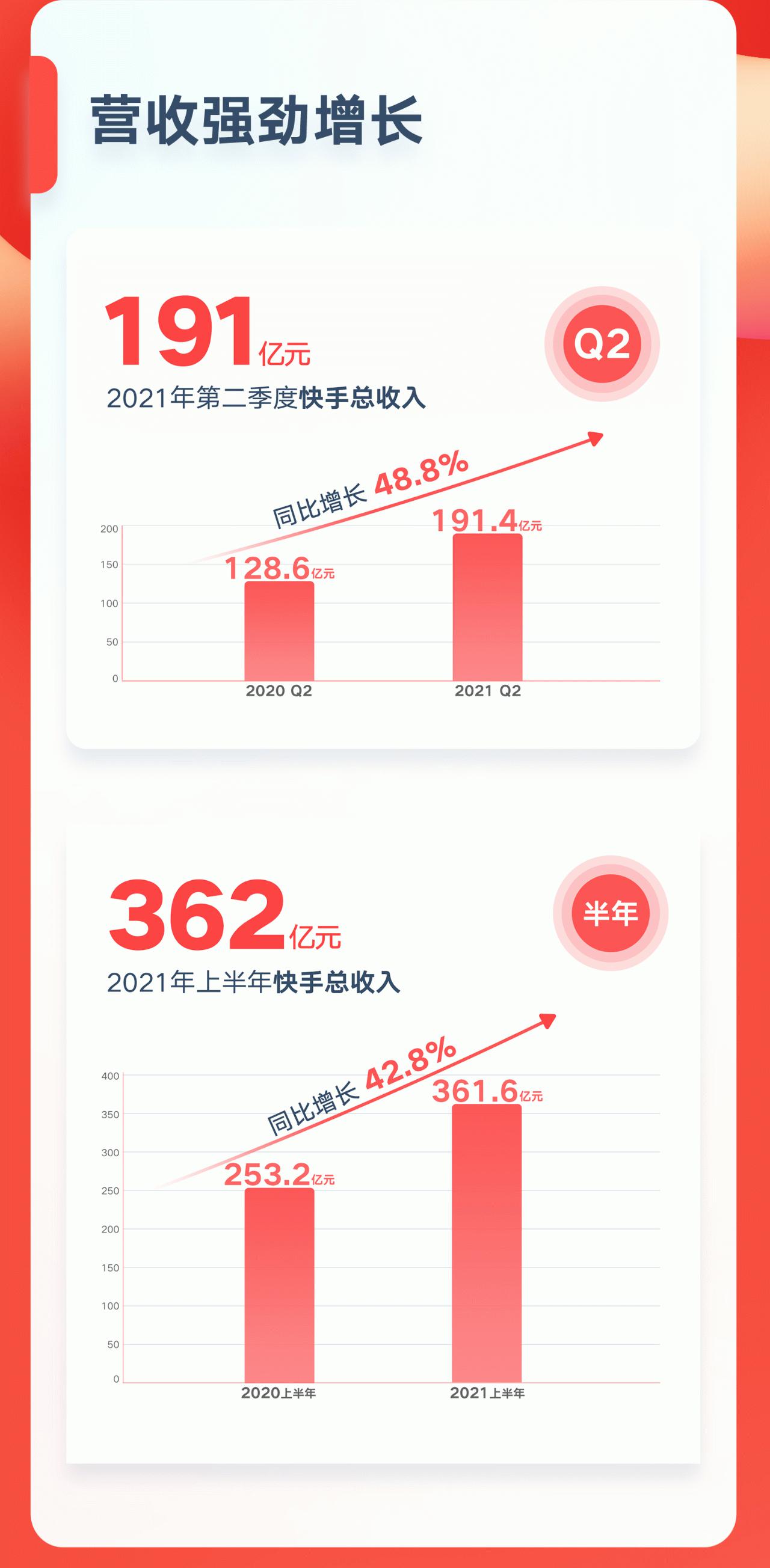 快手2021年Q2营收191.38亿元 同比增长48.8% ......