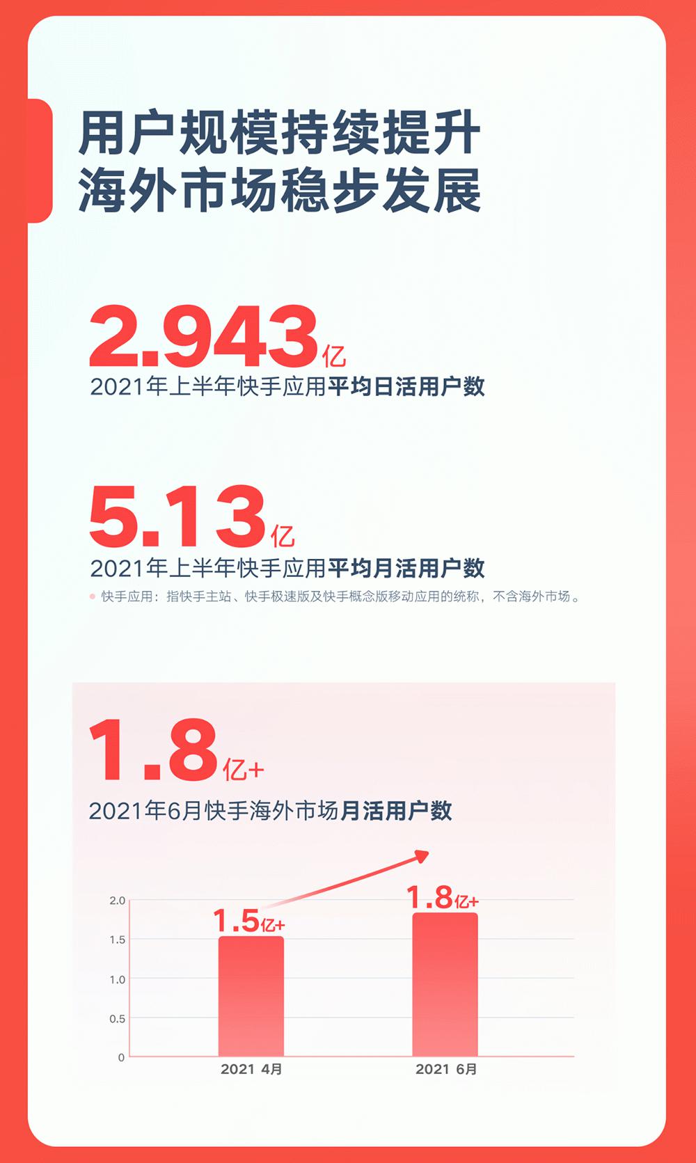 用户数方面,2021年第二季度,快手平均日活跃用户达2.932亿,同比增长11.9%,平均月活跃用户5.13亿。用户时长方面,快手应用每位日活跃用户日均使用时长达到106.9分钟,同比增长25.2%。