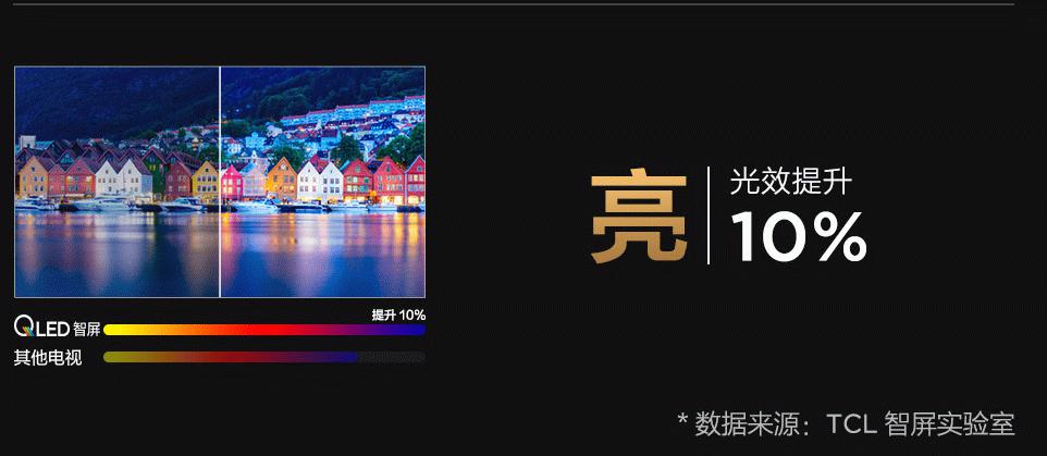 TCL所用的纳米级量子点材料能够发出高色域的白光,所以弥补市面上一些液晶电视因背光源不足导致的亮度、色彩纯度下降的问题,能够给用户带来超细腻的画面体验。在观看较暗的图像时,也能展现出更多丰富的色彩和细节,让暗部更深邃,让亮的地方也清晰可见。