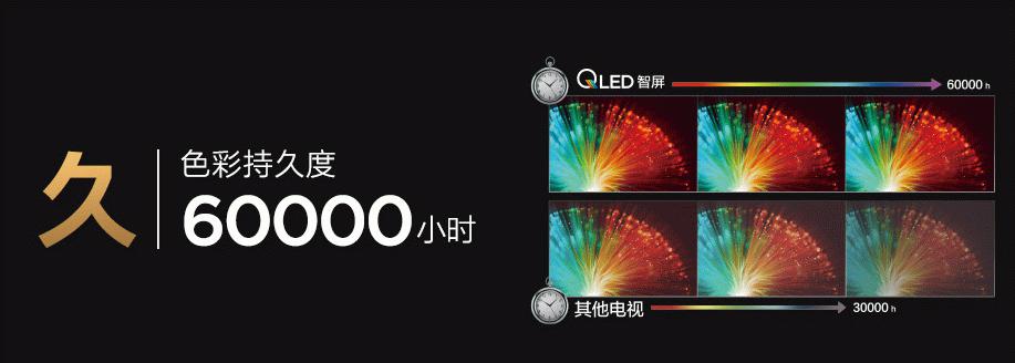 除了上述提到的色域、亮度的提升,TCL 第六代原色量子点技术还有一个最大的优势,就是色彩持久度高达60000小时,如果每天看电视24小时,七年之内智屏都不会出现色彩减弱的现象。从第一代到第六代,我们在见证历史,TCL也在创造历史。