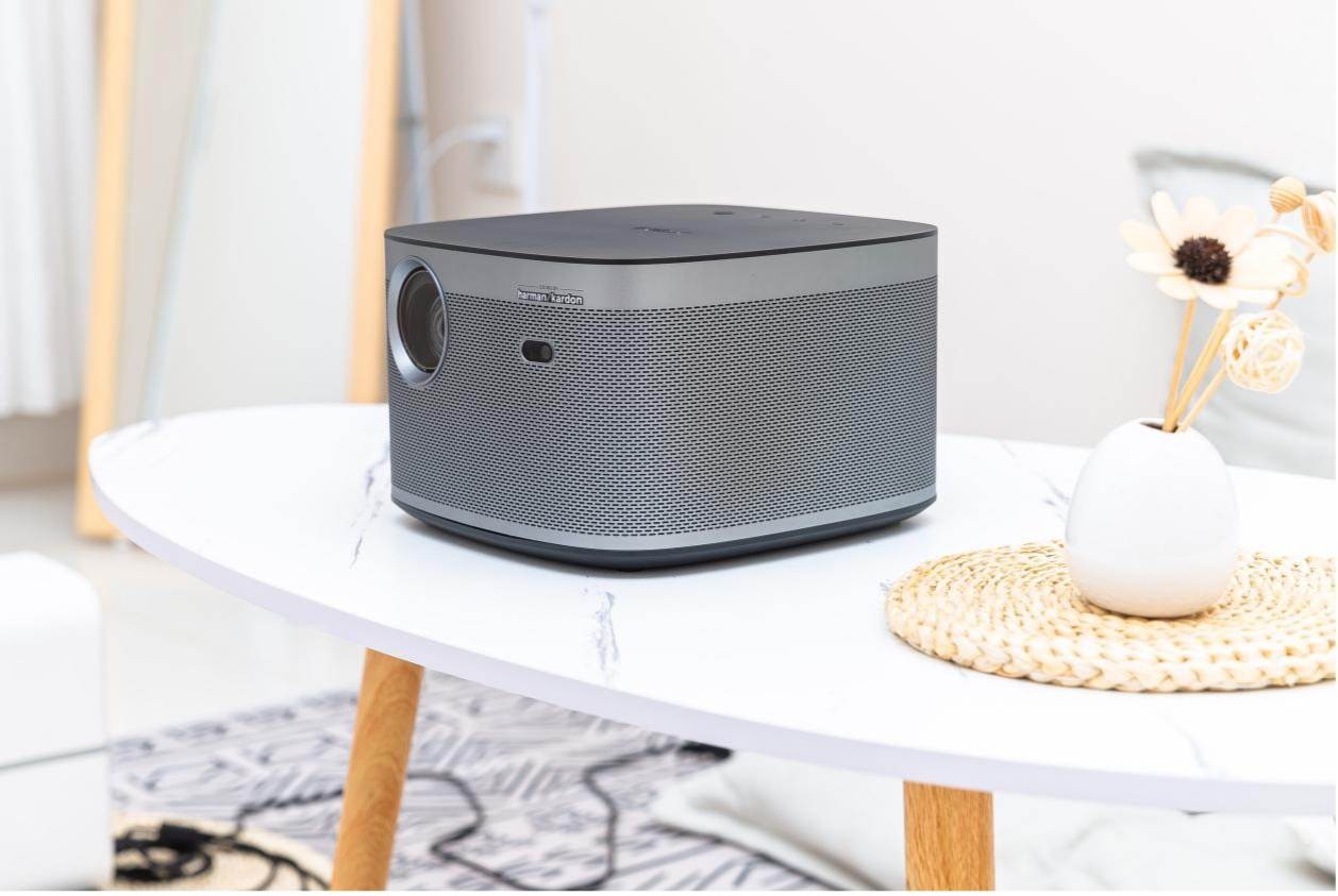 一开始很担心金色买回家和家里装修不搭调,但是到手开箱发现这个金属质感真的很不错,视觉和手感都能体会到这个拉丝的工艺,而且整体干干净净有棱有角。最重要的是投影前面的音响布材料应该非常不错,摸上去很厚实,而且细看是有不同光线反射,右上角哈曼卡顿的标注也代表了内置了哈曼卡顿的音响,很难相信极米把细节做得这么到位,就连这么小的哈曼标志都配合整体色调做成了暗金色,也有细致的纹理,从一个小小的logo就能看出这款产品的用心。