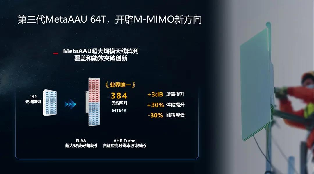 第三代MetaAAU,通过ELAA超大规模天线阵列配合AHR Turbo自适应高分辨波束赋形算法,实现了Massive MIMO性能和能效突破创新。该产品在商用测试中相比传统64T AAU覆盖提升3dB,用户体验提升30%;相比传统32T AAU,覆盖增益达6dB,用户体验提升60%;同时在覆盖指标不变的情况下,基站可配置更低的发射功率,相比传统AAU实现能耗降低约30%。针对共建共享场景,华为第三代MetaAAU会推出带宽400MHz、发射功率400W的超宽频产品,支持C-band 400M以内的所有离散频段,满足频谱离散和共建共享场景的极简部署需求。针对天面空间受限场景,华为进一步丰富BladeAAU产品组合,第三代BladeAAU全系列产品,单天面集成TDD 64T MMIMO、中频8T、低频4T,实现Sub-6GHz全频段极简部署,满足全球各类场景部署需求。