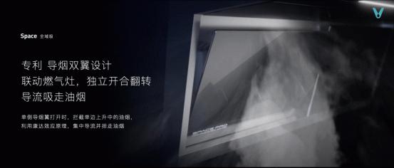 Space 云米AI智目油烟机专利导烟双翼设计联动燃气灶,独立开合翻转导流吸走油烟。单侧导烟翼打开时,拦截单边上升中的油烟,利用康达效应原理,集中导流并排走油烟。系统化的吸烟系统,集中处理油烟问题,无需担心跑烟问题。
