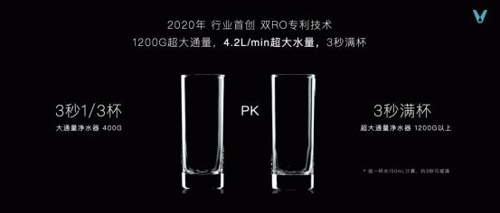 传统净水器普遍存在出水量太小的通病,对此,云米在2020年率先推出双RO专利技术,以1200G超大通量,4.2L/min超大水量,实现3秒满杯,解决出水量小的难题。2022年,云米净水器在通量上又一次实现飞跃性的升级,再次突破流速天花板。