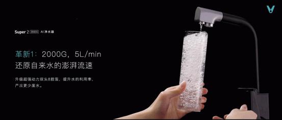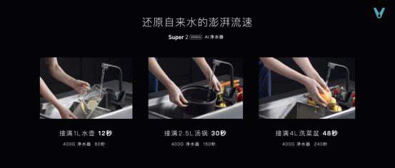 Super2 2000G云水·泉先AI净水器以2000G滂湃海量,升级超强动力双头 8 腔泵,提升水的利用率,产出更少废水,让流速时间更快:以12秒接满1L水壶;30秒接满2.5L汤壶;48秒接满4L洗菜盆的惊人速度,解决传统净水器出水量小、时间久等问题。