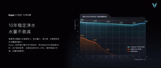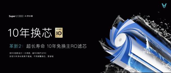 Super2 2000G云米·泉先AI净水器超长寿命10年免换主RO滤芯。使用双RO创新设计一大革新,副RO保护主RO,实现10年净水效果不衰减,不用频繁换芯,更省钱。在不换芯的同时,还能提供10年稳定净水,水量不衰减。普通净水器膜片过滤面积小,进水量小,易污堵,长期使用后出水量越来越小;Super 2采用强力集中式冲洗技术,净水经由主RO流经副RO时,由于直径收窄,水速会加快30%-40%,能有效减少污堵,水量持续澎湃。