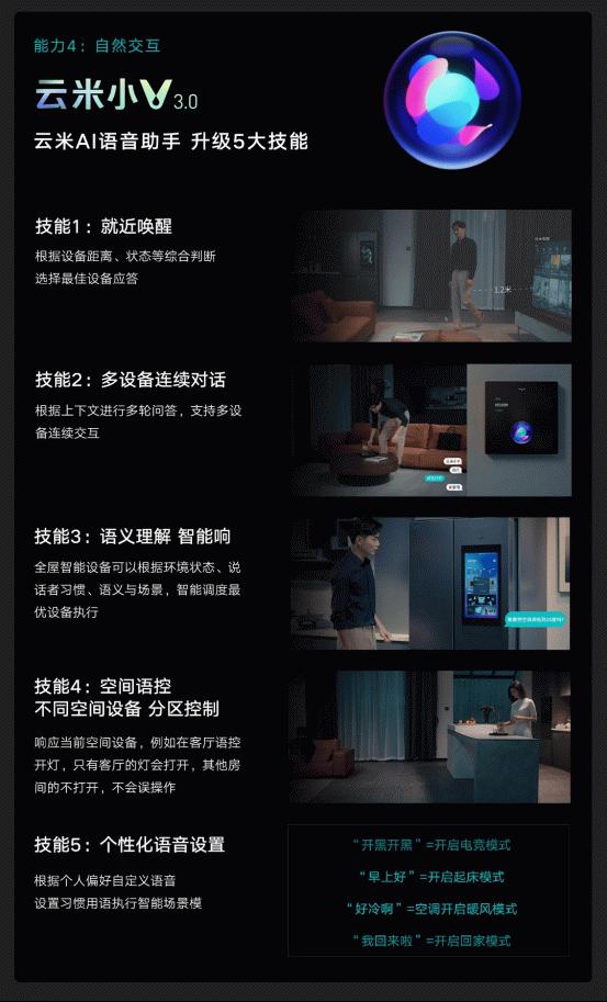 云米小V 3.0全新升级,让自然交互成为可能。想要唤醒设备,用户不用再回到智能音箱附近,云米小V 3.0能根据设备距离、状态等综合判断选择最佳设备应答,避免多设备同时响应的混乱体验,还可以根据上下⽂进⾏多轮问答,⽀持多设备连续交互,⽆需重复唤醒。云米小V 3.0还实现了空间语控,让分区控制成为现实。此外,用户还能根据个⼈偏好⾃定义语⾳,设置习惯⽤语执⾏智能场景模式。云⽶⼩V 3.0,让用户想怎么说就怎么说!