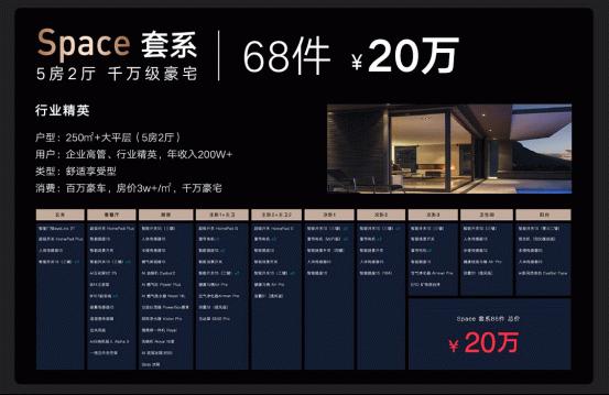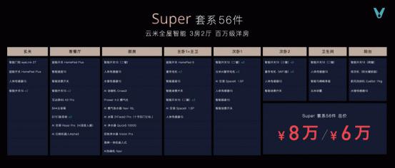 针对行业精英群体,云米搭配了定位高端的 Space 套系,囊括86件智能产品,适用于5房2厅的千万级豪宅,总价20万;针对都市中产人群,云米推出了Super套系,囊括56件智能产品,适用于3房2厅的百万级洋房,总价6-8万,充分满足不同家庭的个性化需求。
