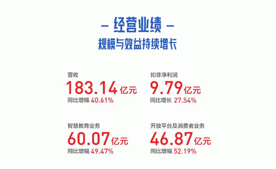 “双减”政策下,科大讯飞智慧教育业务迎来强势增长。一方面,区域“因材施教”解决方案应用成果进一步规模化复制,落地郑州市金水区、武汉市经开区、青岛市西海岸新区、芜湖市弋江区等近20个市、区(县),为师生减负增效,已产生可以用统计数据证明的成效。