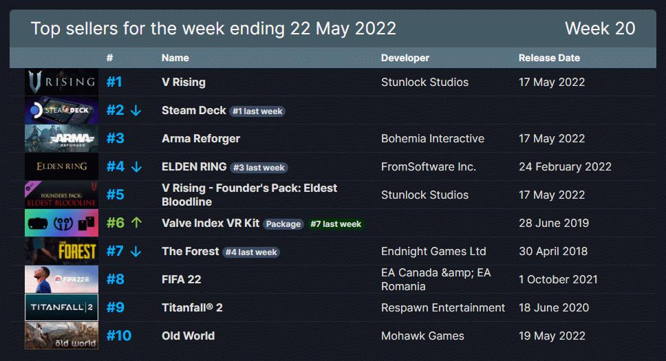 5月23日,Steam公布了新一周(2022年第20周)的销量榜单。霸榜五周的掌机Steam Deck失去榜一宝座,被发售不到一周的新游《V Rising》取代。《V Rising》是一款俯视角RPG游戏,玩家需要扮演一名沉睡数个世纪的吸血鬼,躲避烈日生存的同时重建自己的帝国,目前同时在线玩家稳定在10万以上。Steam Deck在本周退居第二,第三为《武装突袭Reforger》,作为经典现代军事模拟游戏系列的新作,该作获得了大量玩家支持。《艾尔登法环》本周仅排名第四。第五名是《V Rising》的创始人礼包版本。第六名则是V社的VR套件。第七名《森林》。第八名《FIFA 22》在-94%的史低折扣下上榜。第九名的《泰坦陨落2》同样是靠折扣上榜。《旧世界》上周刚刚上架Steam,获得了部分策略游戏爱好者的支持。