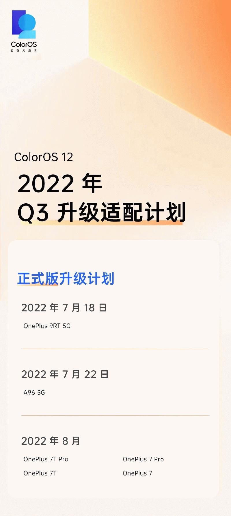 7月1日,ColorOS官方发布了2022年Q3的升级适配计划。7月18日,一加9RT 5G。7月22日,OPPO A96 5G。8月,一加7T/7T Pro和一加7/7 Pro。基于Android 12打造的ColorOS 12系统采用了可坚持36个月流畅不卡顿的双引擎,包括自流畅引擎2.0、量子动画引擎3.0,通过泰尔36个月系统抗老化评测。其中AI自流畅引擎可以智能识别冷热数据,定向整理压缩和场景化清理来实现冷热数据分离,解决存储碎片化的问题,让手机越用越流畅。量子动画引擎通过300多处动画细节的调整,让每一次滑动都更加真实顺畅。