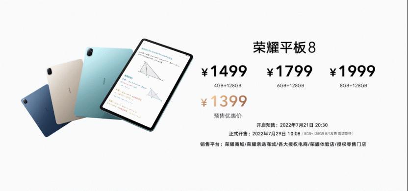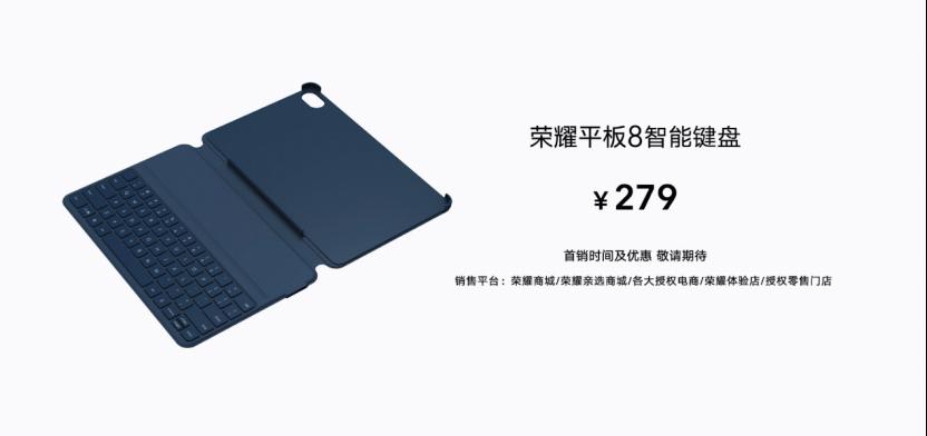 7月21日20:30,荣耀平板8在荣耀商城、荣耀亲选商城、各大授权电商,荣耀体验店和荣耀授权店同步开启预售,4GB+128GB版本官方售价1499元(预售优惠价1399元),6GB+128GB版本官方售价1799元,7月29日10:08正式开售,8GB+128GB版本官方售价1999元,将于8月开售。此次还发布了荣耀亲选推出的荣耀平板8智能键盘,这款键盘可还原笔记本的1.6mm高键程和18.8mm宽键距,打字回弹清晰不生硬,键盘尺寸舒适不局促,双手放上键盘无需适应,文字从指尖畅快输出,与荣耀平板8搭配,助力学习办公效率全面升级。荣耀平板8智能键盘官方售价279元。