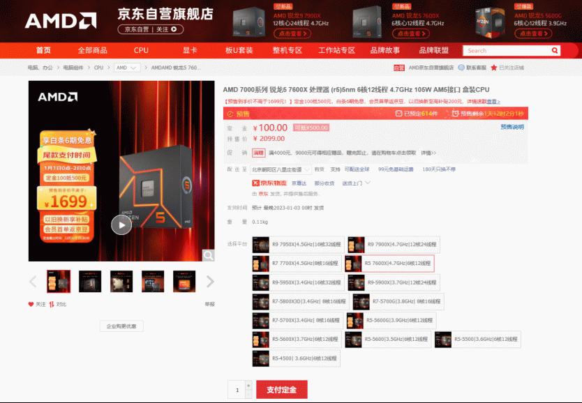 目前AMD 锐龙5 7600X处理器在AMD京东自营旗舰店上正在进行新年预定,2022年的现在支付100元定金,在2023年开启后可以抵500元,最后实际到手只要1699元,持平历史低价哦,同时还能享受白条6期免息的优惠,加入AMD京东自营旗舰店还有各种福利等着大家。所以想要升级自己电脑整机平台的玩家朋友们,快来预定你们新年第一颗处理器吧!