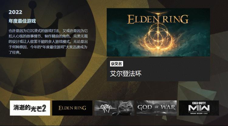 一年一度的STEAM游戏大奖终于在冬季特卖即将结束之际公布了,不负众望,《艾尔登法环》成为年度最佳游戏,而其它几款热门作品《STRAY》、《RAFT》也得到了它们对应的奖项。在2023新年之初,把这些获奖作品在特卖期统统加入库中一定是很多游戏玩家最想做的事情。