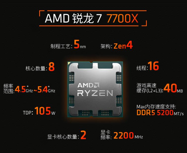 AMD 锐龙7 7700X处理器专为那些想流畅体验3A大作和竞技网游的玩家打造,它采用了业界领先的5nm制程工艺的Zen4架构,搭配8核心16线程的配置和最高5.GHz的CPU频率,40MB的高速游戏缓存非常适合电竞玩家,对于预算相对有限但是仍然想要追求高质量整机的朋友来说非常划算。