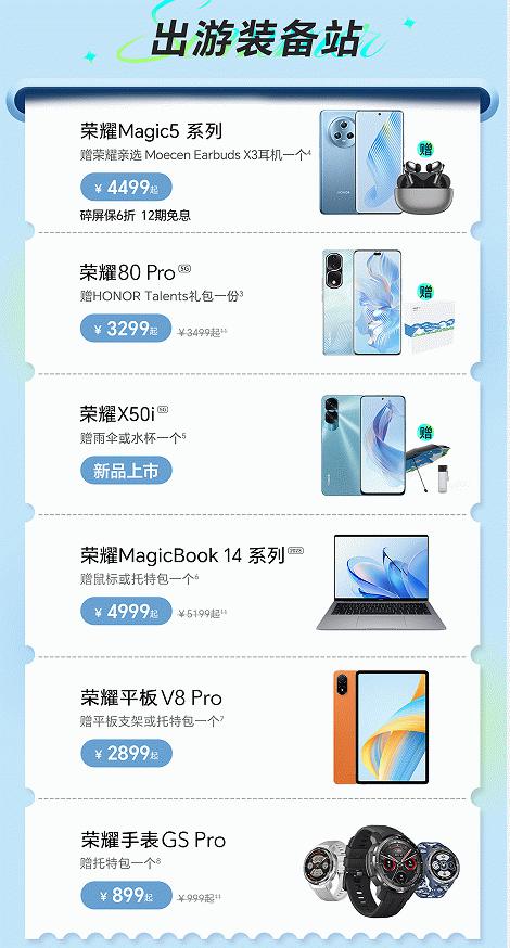 出门旅行当然需要强大的装备助力,本次活动期间,荣耀全国各大门店将同步上线“出游装备站”活动,全场包括荣耀Magic5系列、荣耀80 Pro、荣耀X50i、荣耀MagicBook 14系列2023等大热产品,除了有诚意十足的价格福利之外,每款产品均可享“买即送”促销活动,雨伞、水杯、鼠标、托特包、平板支架等出游大礼包送不停。如购买荣耀Magic5系列就能获赠荣耀亲选Moecen Earbuds X3耳机一副,购买荣耀MagicBook14系列2023便可获赠鼠标或托特包一个,先到先得,赠完即止。