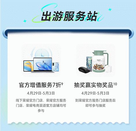 此外,荣耀打造“出游服务站”也为新老用户带来优惠保养服务。活动期间,新老用户前往荣耀门店、荣耀官方服务门店、荣耀电商渠道官方店铺,均可参与享受官方增值服务7折优惠,到门店服务后还可现场参与抽奖,让你装备时刻在线,出行时时安心,精彩随地掌握。