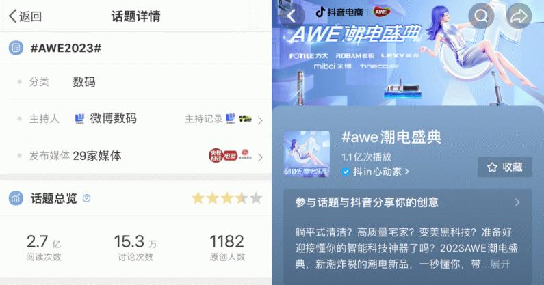 总台央视主持人陈伟鸿、孟湛东、郭若天到现场直播探访AWE展会,探索未来智慧家的新趋势、新潮流;AWE联合京东家电家居开启“五一焕新周”,从价格、产品到服务,全方位加持消费体验;抖音电商官方话题“AWE潮电盛典”发起了一场智能科技的狂欢,与抖音官方展区“心动潮电展”联动,并在涂磊、噗噗叽叽等达人的带动下,共获得了超1.1亿次播放。无数网友通过来自上海新国际博览中心AWE现场的镜头,了解和感知未来智慧生活的最新成果。此外,#AWE2023#、#上海AWE有多好逛#等多个微博话题都登上了微博热搜榜,足以证明消费者对于AWE2023的关注。据组委会统计,AWE2023相关微博话题下,网友、媒体、参展企业与官方积极互动,共产生了超过15.3万次讨论;在30日中午截稿时,微博阅读数总计超过2.7亿次,再创新纪录。