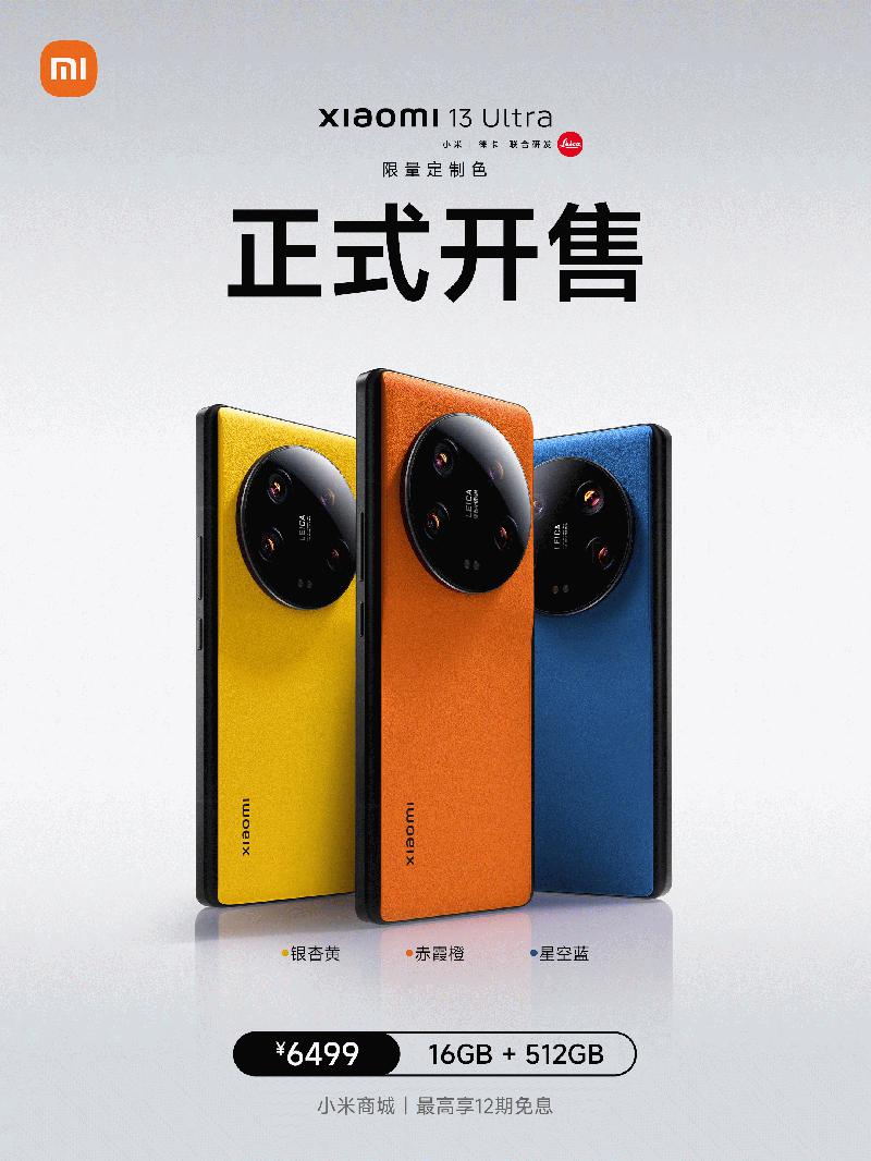 5月6日,小米13和小米13 Ultra限量定制色正式开售。包括星空蓝、赤霞橙、银杏黄三种配色。整机撞色设计,点缀黑色LOGO,满满时尚感。