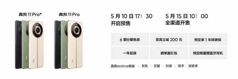 真我11系列将于2023年5月15日上午10点全渠道正式开售,首销预定购买还可以享受一年碎屏险、一年延保专属权益、6期免息分期、晒单赢红包等惊喜福利。