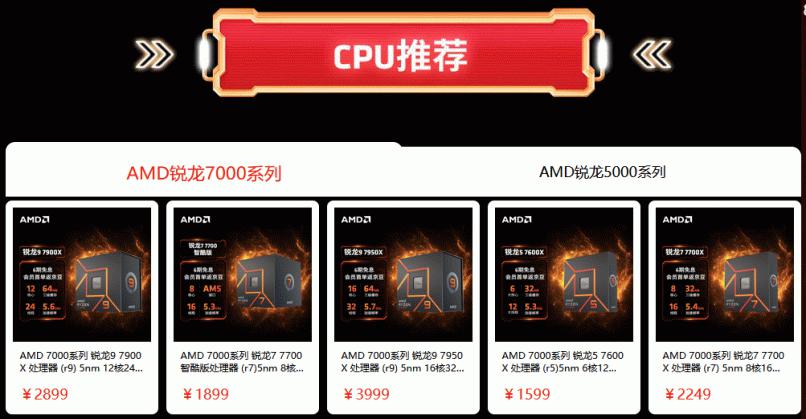 AMD京东自营旗舰店爆品抢购阶段还包含了多种DIY商品,不仅有最为热销的锐龙7000处理器单品,还有板U套装和CPU+主板+内存三件套装,让您一站式购齐直接搭建出全新的AM5平台战未来。当然还有各大装机品牌商使用锐龙处理器打造的整机产品,对于不熟悉攒机的小伙伴非常友好。当然活动页面还有更多DIY产品等待大家的挖掘,总有适合您的那一款。