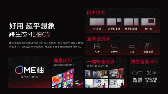 在家庭女主人关注的健身瑜伽、大屏购物场景中,康佳G7携跨生态ME柚OS开启大屏交互新纪元,海量应用兼容大部分跨端APP,上大屏幕还得大屏才过瘾;1:1 拼接、大屏拼小屏等自由拼屏实现了多场景屏的同步展现,一边健身一边看电影,一边追剧一边视频聊天,一边上课一边记笔记等怎么拼都绝配,解锁了更多奇思妙想的应用场景,解决了传统电视交互繁琐界面单一、可兼容应用少等痛点,支持四路投屏、离线投屏,连接速率秒级,画面延迟毫秒级,带来更丰富多元的全新体验。同时覆盖各大主流平台,汇集海量热门影视剧综艺、动漫、纪录片等优质影音资源,应有尽有。G7还支持外接分体式AI摄像头,可通过小康在家远程看护家里小孩、老人等,远程看护支持录像、抓拍,一举一动尽在掌控之中哦。
