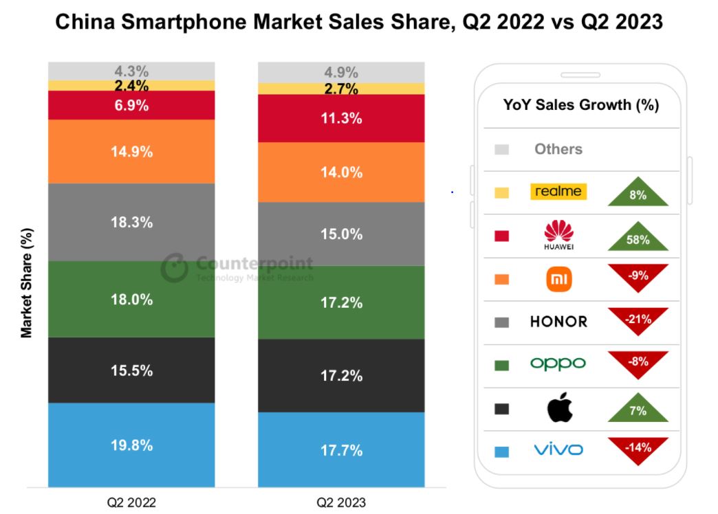 中国智能手机市场Q2季度销量下降,苹果、华为、realme逆势增长