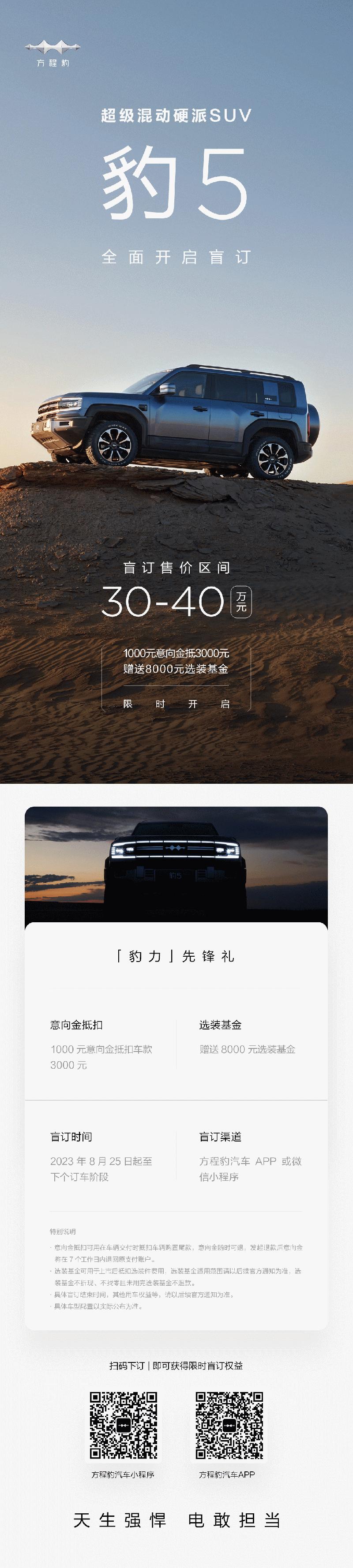 【小熊在线讯】8月25日,“天生强悍,电敢担当”方程豹汽车成都车展发布会如期而至,万众瞩目下,方程豹首款战略车型 豹5正式发布,即日起正式开启盲订,盲订价格区间为30-40万元,可通过方程豹汽车APP或微信小程序预订。方程豹汽车为首批用户准备了「豹力」先锋礼——盲订1000元意向金可抵扣车款3000元,另外还赠送8000元选装基金。