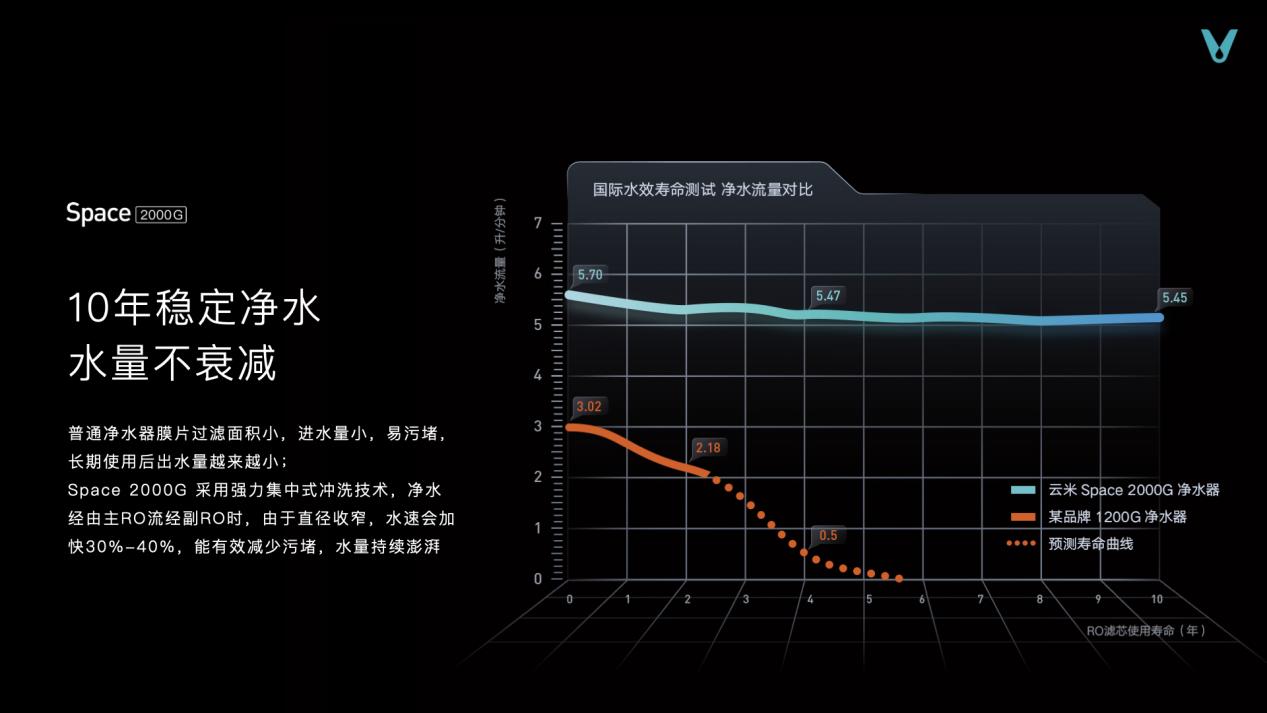 此外,使用成本和产品寿命也是用户所关心的问题。对此,云米推出了“10年长效免换RO滤芯”服务,不用频繁换芯让消费者能以更低的成本无忧使用。同时,Space 2000G AI净水器采用的双RO技术能让副RO保护主RO滤芯,实现10年净水效果不衰减,有效提升滤芯寿命。为了保持长久使用水量不衰减,Space 2000G AI净水器还利用强力集中式冲洗技术保持10年稳定净水,通过收窄直径、提升水速,破解以往普通净水器因膜片过滤面积小、进水量小导致的易污堵、长期出水量变小等问题,让水量持续澎湃。