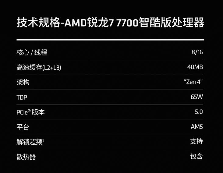 AMD 锐龙7 7700处理器是年初上市的AMD锐龙7000智酷版产品中的一款,专为那些对游戏性能有较高要求的学生玩家打造,首发时这款产品的价格在2300元左右,年中大促更是来到了2000元这个价位,而目前散片价格竟然可以来到1600元以下,对于不想要盒装赠送散热器自己搭配的玩家来说也不会浪费,目前搭配这些降价后的B650芯片组主板组成的套装更是为学生们省下了一笔不小的预算,AMD承诺AM5平台战斗到2025年+不成问题。下面我们就来详细了解一下锐龙7 7700处理器的具体性能。