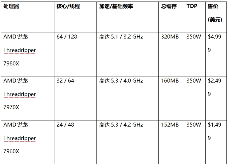 与此同时,AMD还推出了锐龙 Threadripper 7000系列处理器,自2020年以来首次重返HEDT生态圈。AMD锐龙 Threadripper 7980X处理器保持了AMD对创意和专业用户的高标准,为发烧级台式机提供了更为强大的算力,并为追求巅峰的用户提供了卓越的多线程性能。这些处理器同样基于 “Zen 4”架构,为台式机用户提供多达48个PCIe5.0通道,并最高具备64核心128线程设计,可实现超越想像的性能和效率。